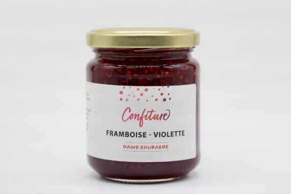 Ingrédients : framboises(65 %), sucre, jus de citron (2 %), concentré violette (0.01 %)agar-agar.